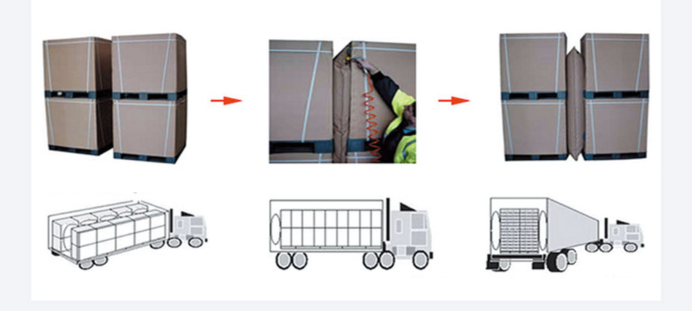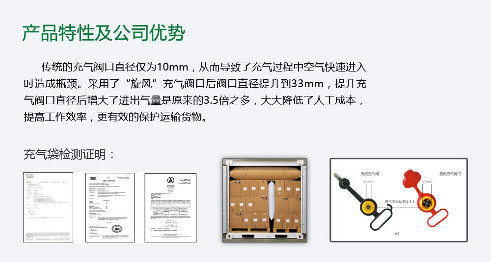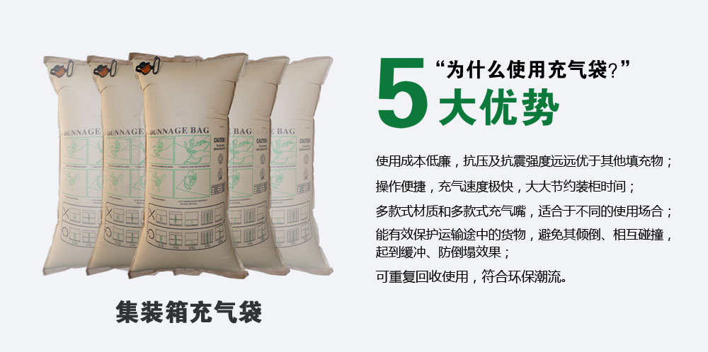 集裝箱充氣袋是一種創新和簡易的運輸保護工具,采用PP及PE覆蓋的牛皮紙作為堅韌的外袋和氣密性很高的內袋并裝配氣閥加工而成,內袋是要由PP或PE為主的5層拱劑膜制成。